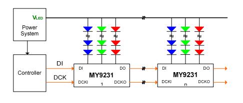 MY9231是一颗3通道(支援R/G/B x 1)恆流LED驱动芯片内建灰阶自适应脉冲密度调制, 操作在 3.3伏特到5伏特的输入电压范围(±10%)。MY9231包括了3个漏极开路的定电流沉入输出,可承受24伏特且可输出350毫安的高精度电流给每一串LED。 MY9231的三組輸出电流可被三个外接电阻设置。MY9231提供一独特的可降低电磁干扰的最大10MHz的资料/时钟输入方式。 MY9231也提供了2线串接的介面以传送灰阶资料及命令,资料包括16/14/12/8位灰阶选择,芯片內部灰阶时钟降频选择,输出极性选择以支援高功率LED驱动,输出上升缘Tr/下降缘Tf速度选择,使用传统脉冲宽度调制或独家自适应脉冲密度调製选择,以及内部自动生成锁存信号。 MY9231独特的自适应脉冲密度调制方式可以将刷新率大幅提高至2000Hz @16位灰阶时以避免闪烁。另外MY9231利用时钟占空比回復技术以及脉冲宽度重置技术来有效支援长距离及多级串接的应用。MY9231提供一般值±1.5%的通道间LED输出电流精度,而且还包括了提供相对于输出脚电压变化±0.1%稳定的电流输出能力以及快速的输出电流响应。MY9231可提供16脚的TSSOP(Exposed Pad)或16脚的SSOP封装型式。MY9231可以工作於外在环境温度-40°C到+85°C的范围。