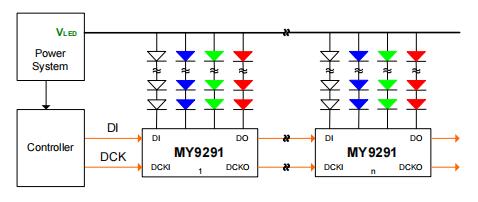 MY9291 是 一 颗 4 或 3 通 道 ( 支 援 R/G/B/Amber x 1, R/G/B/W x 1, R/G/B x 1)恆流LED驱动芯片内建灰阶自适应脉冲密度调制, 操作在 3.3伏特到5伏特的输入电压范围(±10%)。MY9291包括了4个漏极开路的定电流沉入输出,可承受24伏特且可输出350毫安的高精度电流给每一串LED。MY9291的四組輸出电流可被四个外接电阻设置。 MY9291提供一独特的可降低电磁干扰的最大10MHz的资料/时钟输入方式。 MY9291也提供了2线串接的介面以传送灰阶资料及命令,资料包括16/14/12/8位灰阶选择,芯片內部灰阶时钟降频选择,输出极性选择以支援高功率LED驱动,输出上升缘Tr/下降缘Tf速度选择,使用传统脉冲宽度调制或独家自适应脉冲密度调製选择,以及内部自动生成锁存信号。 MY9291独特的自适应脉冲密度调制方式可以将刷新率大幅提高至2000Hz @16位灰阶时以避免闪烁。另外MY9291利用时钟占空比回復技术以及脉冲宽度重置技术来有效支援长距离及多级串接的应用。 MY9291提供一般值±1.5%的通道间LED输出电流精度,而且还包括了提供相对于输出脚电压变化±0.1%稳定的电流输出能力以及快速的输出电流响应。MY9291可提供 20脚的TSSOP(Exposed Pad)或 20脚的QFN封装型式。MY9291可以工作於外在环境温度-40°C到+85°C的范围。