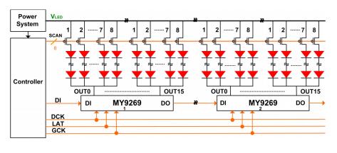MY9269 使用 4 线的串行输入接口,内存储器空间容量4KBits,用来储存多组扫描灰阶数据。串行输入界面使微控器能藉由四个输入(DI、DCK、LAT 和 GCK)及资料输出(DO)控制恒流输出端口。DO 使多个驱动器能够级联在一起操作。