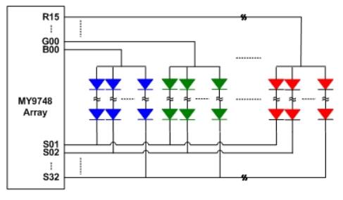 MY9748 使用 4 线的串行输入接口,内存储器空间容量3x16KBits,用来储存多组扫描灰阶数据。串行输入界面使微控器能藉由四个输入(DI、DCK、LAT 和 GCK)及资料输出(DO)控制恒流输出端口。DO 使多个驱动器能够级联在一起操作。