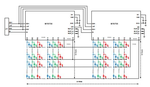 MY9758 使用 4 线的串行输入接口,内存储器空间容量3x16KBits,用来储存多组扫描灰阶数据。串行输入界面使微控器能藉由四个输入(DI、DCK、LAT 和 GCK)及资料输出(DO)控制恒流输出端口。DO 使多个驱动器能够级联在一起操作。