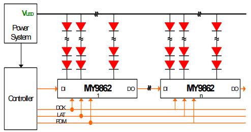 MY9862可在3.3到5.0伏特(±10%)的工作电压下正常操作。芯片提供16个最大承受电压15伏特的漏极开路恒流沉入输出,并可藉由一个外接电阻来设定电流的输出大小及透过电流增益调整功能对恒流输出作线性64阶调整。MY9862使用4线的串行输入接口,使控制器能藉由四个输入(DI、 DCK、LAT和PDM)控制恒流输出端口以及利用资料输出(DO)使得多个驱动器能够串连在一起操作。输入端采用Schmitt trigger设计可以有效抑制讯号噪音干扰。内建电源开启重置可避免芯片错误动作。